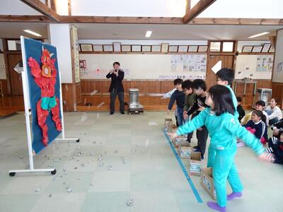 1月28日(水)の児童朝会時に、少し早い節分集会を行いました。集会では、各学年の代表者が、自分の中の退治したい鬼を発表しました。後回し鬼、めんどくさい鬼、イラッと鬼、夜更かし鬼、寝不足鬼、やりたくない鬼、怒り鬼など…、様々な鬼が発表されました。その後は、児童全員が大きな鬼の絵に向かって、「鬼は外、福は内~」とかけ声をかけながら、それぞれの鬼を退治しようと新聞紙で作られた豆を交互に投げました。さて、一人一人の鬼は退治されたのでしょうか?これからの暮らしぶりに期待です。